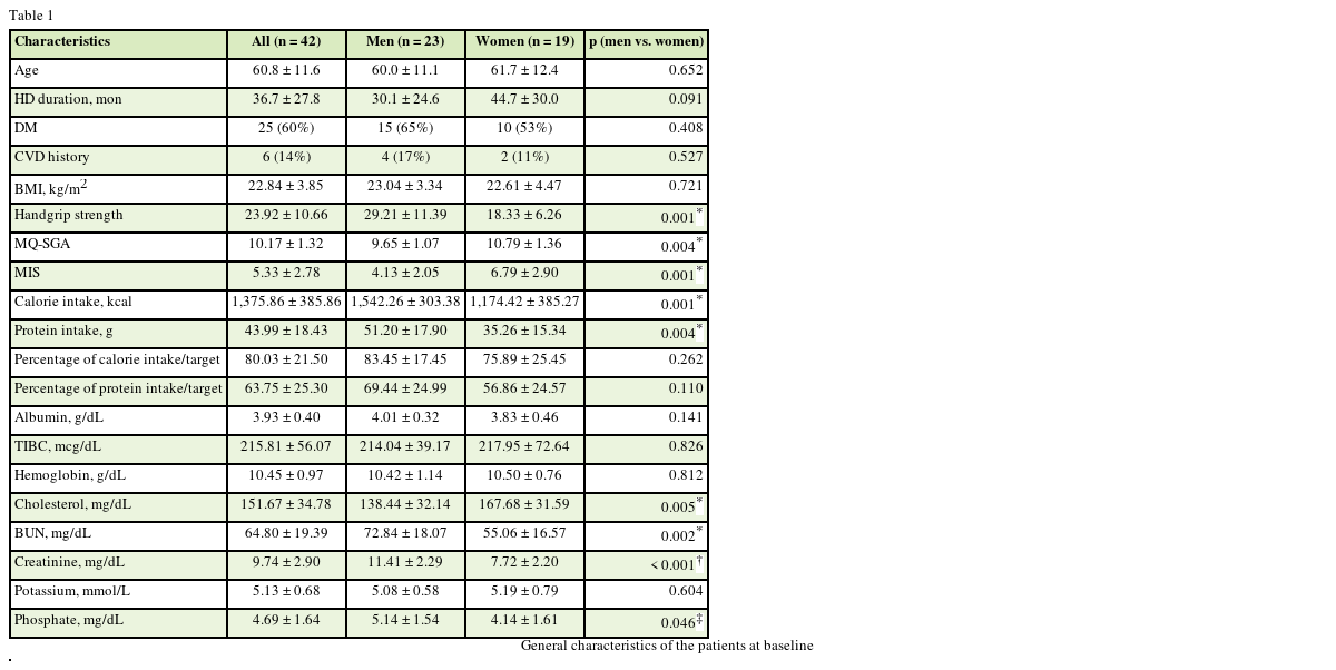 Table 1. Among the 42 patients, 19 were women, and 25 had diabetes mellitus while 6 had a cardiovascular disease. The mean age of the patients was 60.8 ± 11.6 years, and their mean dialysis duration was 36.7 ± 27.8 months. The mean BMI was 22.84 ± 3.85 kg/m