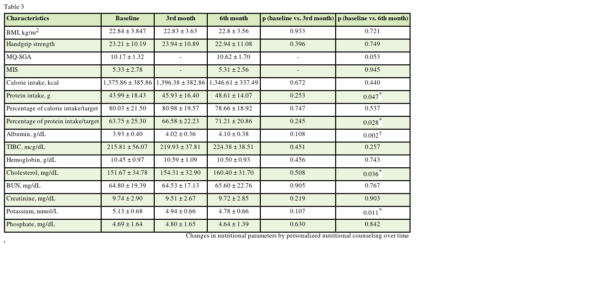 After 3 continuous, individualized nutritional counseling sessions, there was no significant change in the HD patients' dietary intake and biochemical data at 3 months. However, the protein intake, serum albumin, and cholesterol levels had improved at 6 months. Among the BIA results, there was a significant reduction in the BCM and FFM at 3 months, although they had recovered without a significant difference from baseline at 6 months. The wasting of the body composition was found to be delayed. There was a significant improvement in the serum albumin and cholesterol levels of patients affected by malnutrition. Therefore, continuous nutritional management for at least 6 months is considered to contribute to the improvement of HD patients' nutritional status. As the benefits of nutritional management are particularly significant in patients with severe malnutrition, screening for malnutrition and the early initiation of nutritional management are required.
