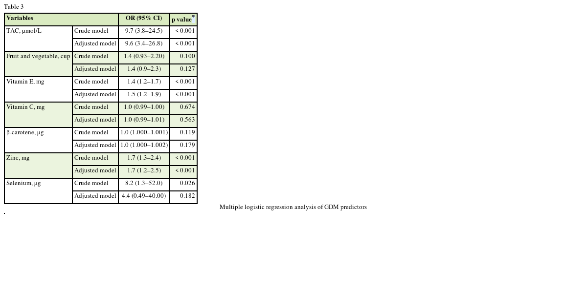 Multivariate logistic regression analysis showed that TAC, vitamin E, and zinc intakes were significantly associated with the risk of GDM. For every unit increase in TAC, the odds of GDM were reduced by 9.6 fold. It was also found that for every unit increase vitamin E intake, the odds of GDM were reduced by 1.5 fold. In addition, for every unit increase in zinc intake, the odds of GDM were reduced by 1.7 fold (Table 3).