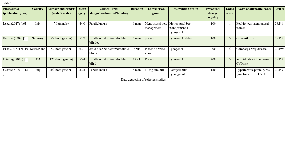 Present meta-analysis pooled results from 5 randomized clinical trials about the effect of Pycnogenol supplementation on CRP level. The results showed Pycnogenol consumption can decrease the level of CRP and has anti-inflammatory effect. Larger randomize clinical trial with long duration of treatment are needed to confirm the anti-inflammatory effect of Pycnogenol.