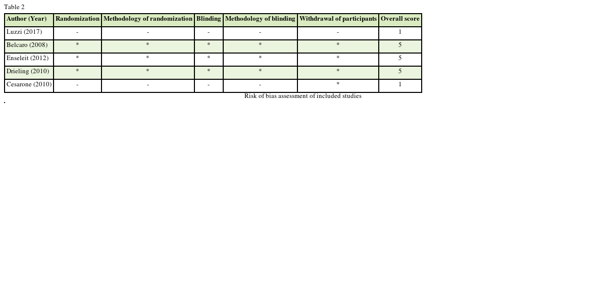 Table 2. The control groups of 3 were randomized by a blinding method. Two studies did not used a randomized controlled design. Most of the studies had a few dropouts. Therefore, 3 trials earned a scores of 5 and were considered of as a high quality, whereas 2 studies received a score of 1 and were considered to be of low quality. Two studies investigated Pycnogenol at a dose of 100 mg/d, one study investigated Pycnogenol at a dose of 150 mg/d, and 2 studies investigated Pycnogenol at a dose of 200 mg/d. In 4 studies administered Pycnogenoltablets at a dose of 50 mg to achieve the final dose, whereas in one study, Pycnogenol was administered as a single dose of 300 mg and repeated doses of 200 mg [
