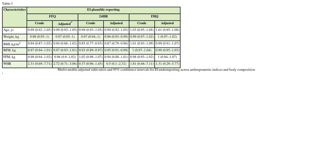Table 3 Multivariable-adjusted odds ratios and 95% confidence intervals for EI underreporting across anthropometric indices and body composition