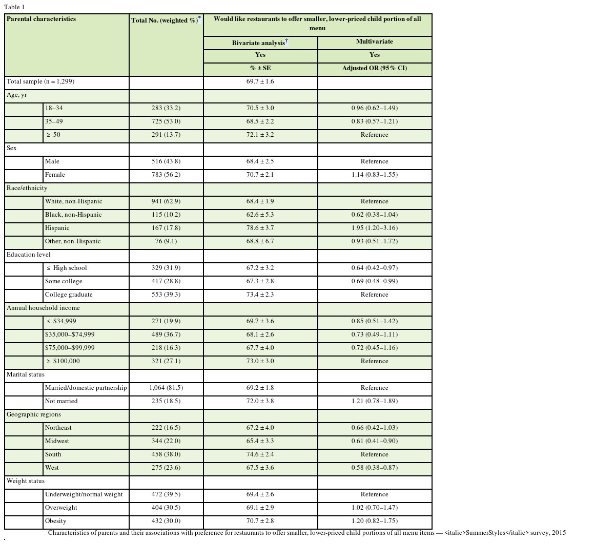 Table 1 Characteristics of parents and their associations with preference for restaurants to offer smaller, lower-priced child portions of all menu items — SummerStyles survey, 2015