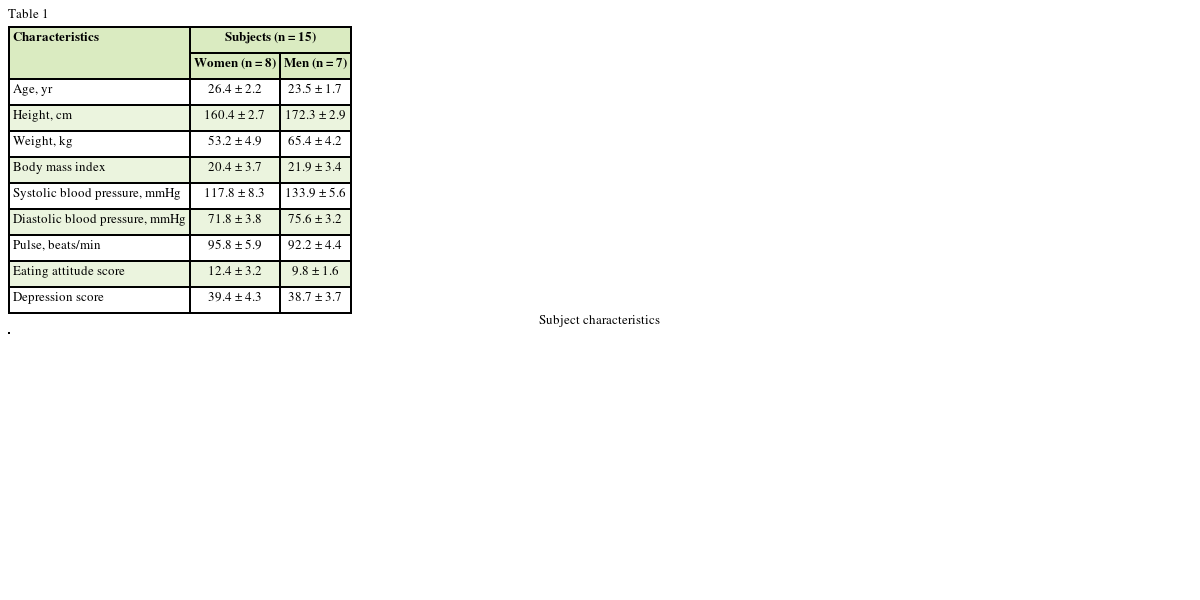 Subjects were recruited via advertisement in a local newspaper. Recruited individuals were interviewed to ensure they met the following criteria: healthy, 20–30 years of age; body mass index (BMI) of 18–30 kg/m2; not taking medication known to influence energy intake or appetite; not athletes in training; not pregnant or lactating; non-smokers; free from food allergies; stable in weight in the past 6 months; and not on a diet to gain or lose weight. The Eating Attitudes Test [12], which measures attitudes towards foods and eating, and the Zung Self-Rating Questionnaire [13], which assess symptoms of depression were also included in the criteria. Volunteers who scored less than 20 on the Eating Attitudes Test and less than 42 on the Zung Self-Rating Questionnaire were selected for participation. The study was approved by the Ethical Committee for Human Experimentation, Jeonju University, and was conducted in accordance with the Committee's rules and regulations (jjIRB-160919-HR-2016-0904). Before commencing study, subjects' height was measured using the DS-102 (Jenix Co., Seoul, Korea); their weight and body composition (body fat and lean body mass) were measured using the InBody 770 (Biospace Co., Seoul, Korea) while wearing light clothing. BMI (kg/m2) was calculated as body weight (kg)/[height (m)]2. Blood pressure was measured in a standardized fashion using a BP203RV blood pressure monitor (Colin, Komaki, Japan).