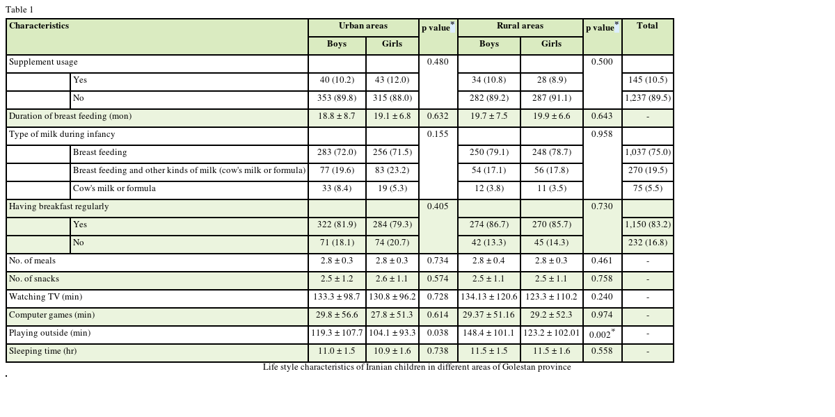 Table 1 Life style characteristics of Iranian children in different areas of Golestan province