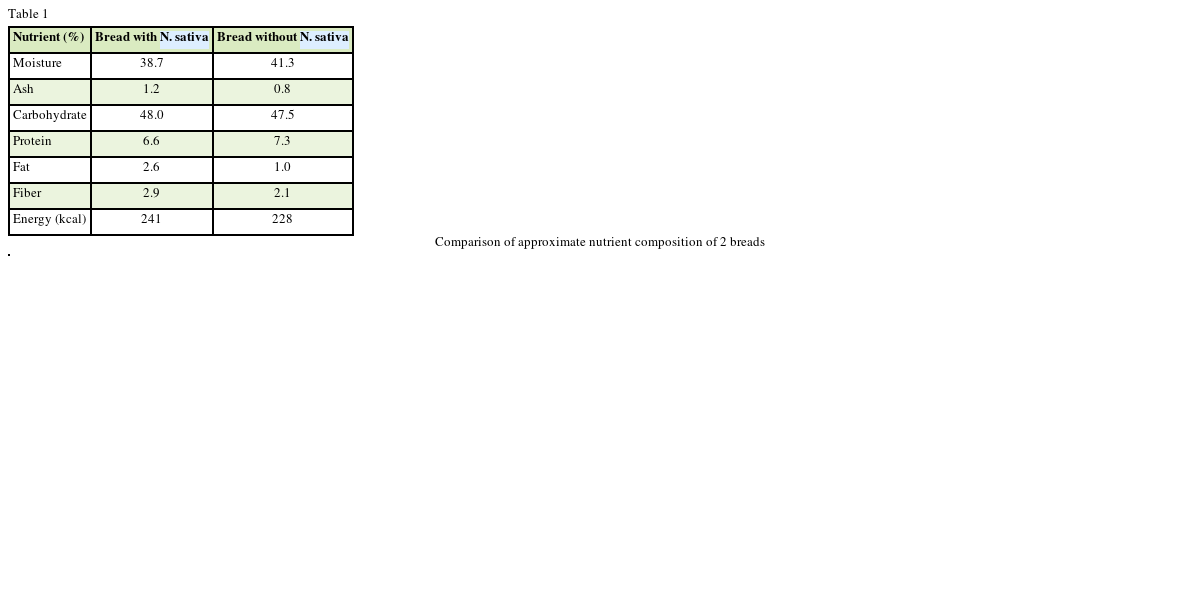 Table 1. According to this table, there was much difference in the fat content of 2 types of bread due to high polyunsaturated fatty acids contents in the black seed.