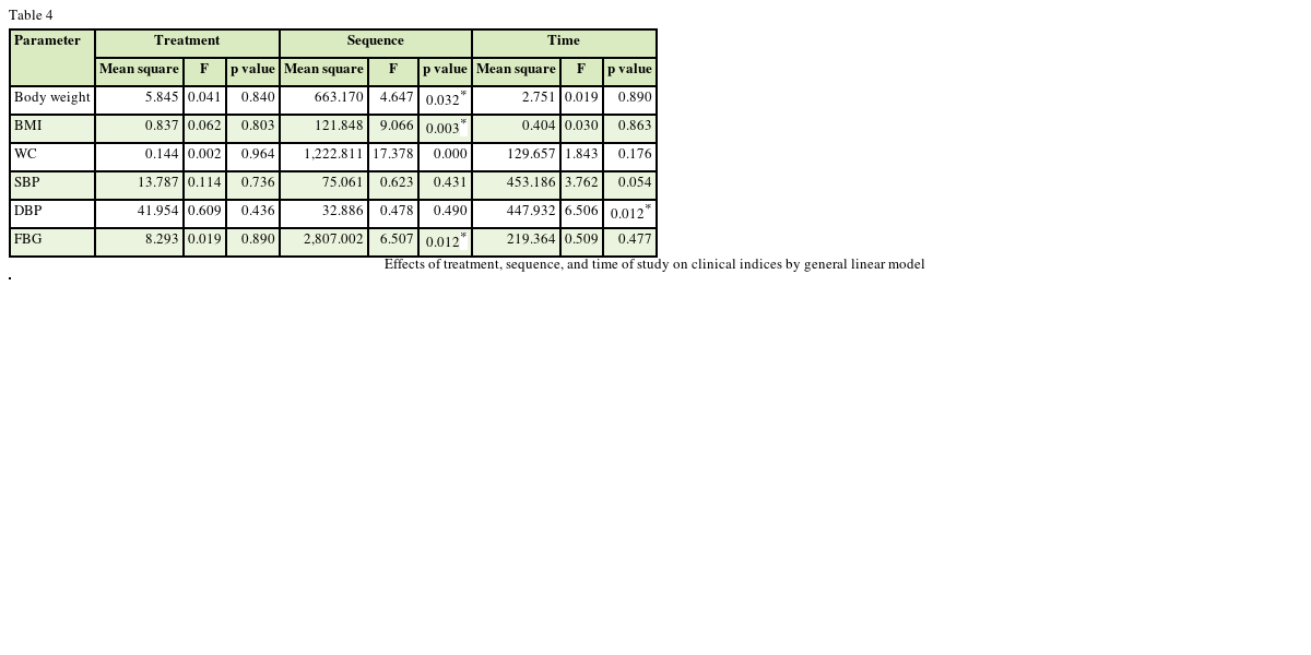 In regard to anthropometry indices (body weight, WC, and BMI), this study did not show any significant change (as treatment effect of study) by