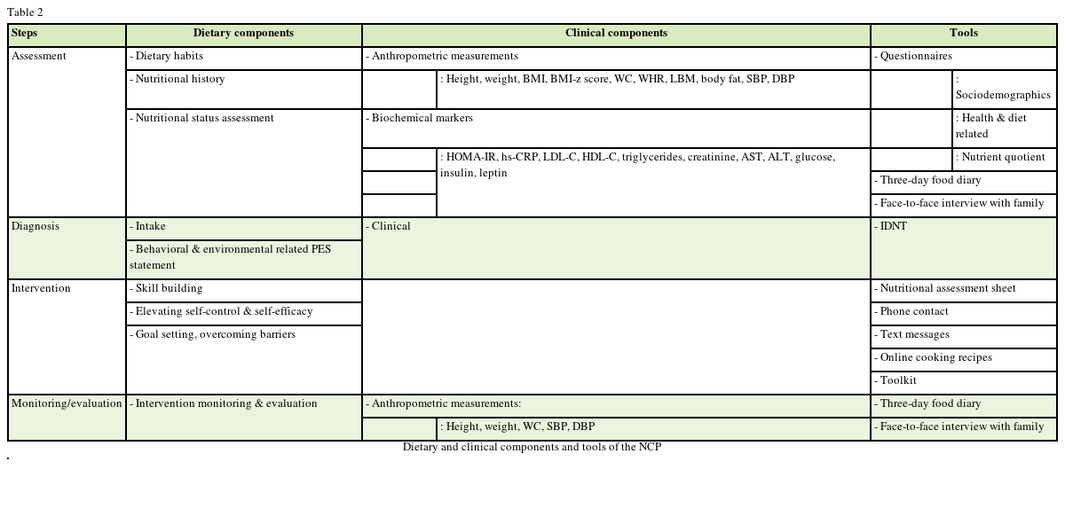 An evidence-based nutritional intervention protocol was developed to adopt the NCP model to care for and manage childhood obesity. To assess the nutritional status of the participants, dietary habits, nutritional intake, medication and supplement history, life and social history, medical/health history, anthropometrics and biochemical markers were used by a nutrition expert. In this step, nutrition-related metabolic risk factors, dietary problems, nutritional knowledge, stages of change and the nutritional status based on an individual Dietary Reference Intake (DRI) were evaluated (Table 2).