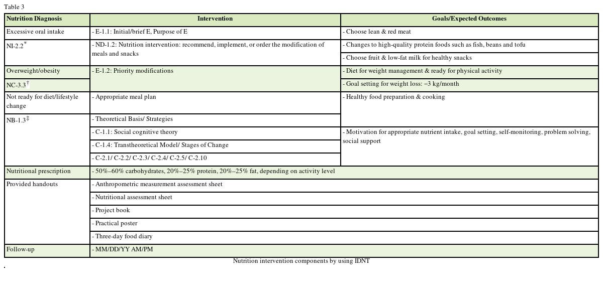 A specific nutrition problem was identified by a PES statement from the nutrition assessment data for nutrition diagnosis. In this critical step, a nutrition problem was described by using standardized nutrition diagnosis language such as “inadequate energy intake,” “overweight/obesity,” and “food and nutrition-related knowledge deficit.” A nutrition expert team analyzed the terminology to label the nutritional diagnosis by using three main domains for treatment: intake, clinical and behavioral. Each selected International Dietetics and Nutrition Terminology (IDNT, 2015) were labeled for the three domains from the initial screening of the participants' dietary problems (data not shown).
