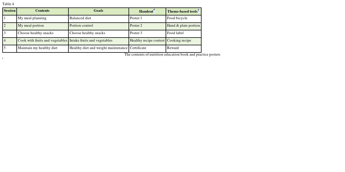 All content in the nutritional intervention toolkit was developed by a nutrition expert team. Based on the study protocol, an educational toolkit was provided to the participants at the first nutrition education and counselling session (Visit 1). The program book and posters were able to be displayed at home where families who participate in the nutritional intervention program could support and help each other. The contents of each page consisted of the monthly title, a poster with an illustrated guideline for a practical mission, and a goal-setting space. Three different mission posters were handed out at the baseline, and fourth and eighth weeks of the nutrition session. After tracking each monthly poster, the participants and their families were encouraged to upload the completed posters on the community website.