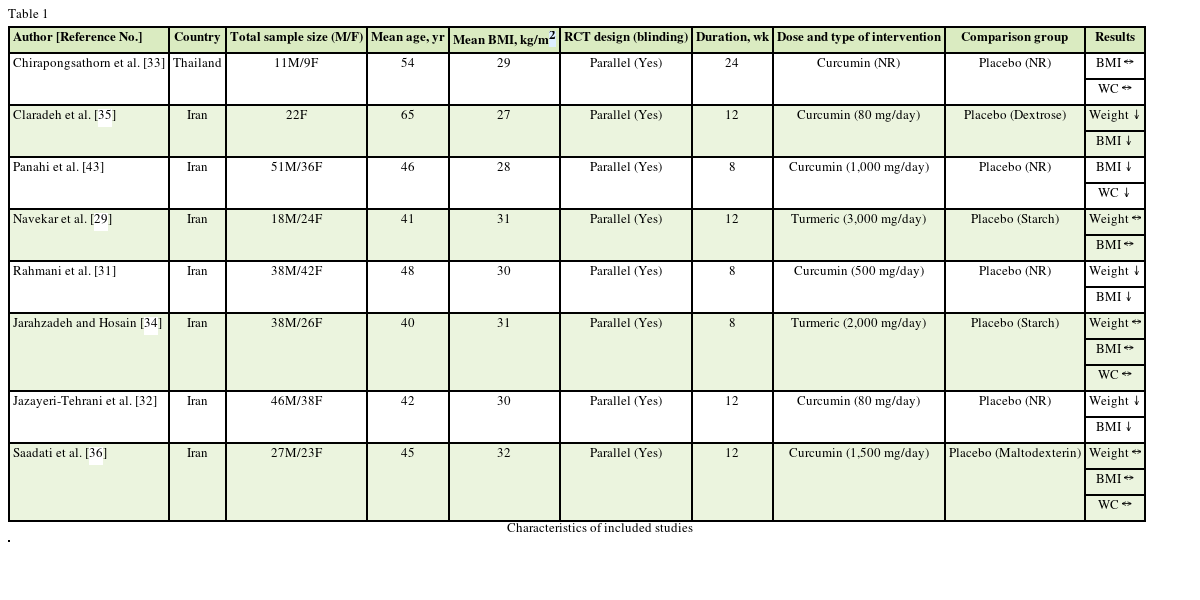 36] curcumin was administered. The dosage of the intervention varied from 80 to 100 mg/day and 2 to 3 g/day for curcumin and turmeric, respectively. The trial durations were between 8 and 24 weeks. All studies were carried out on subjects with baseline BMI ≥25 kg/m