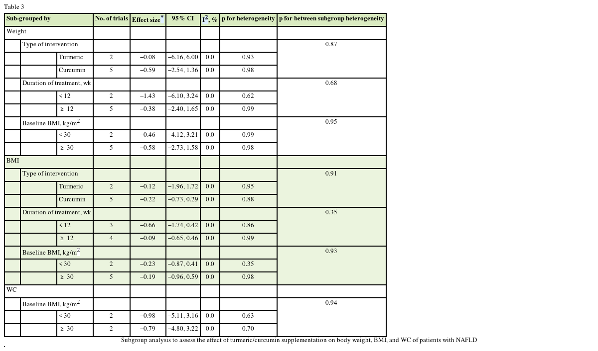 In present study, we found that supplementation of turmeric/curcumin had no significant effect on body weight, BMI and WC in patients with NAFLD. In addition, the findings of the classification based on the baseline BMI, type of administration and trial duration were in line with the overall results.