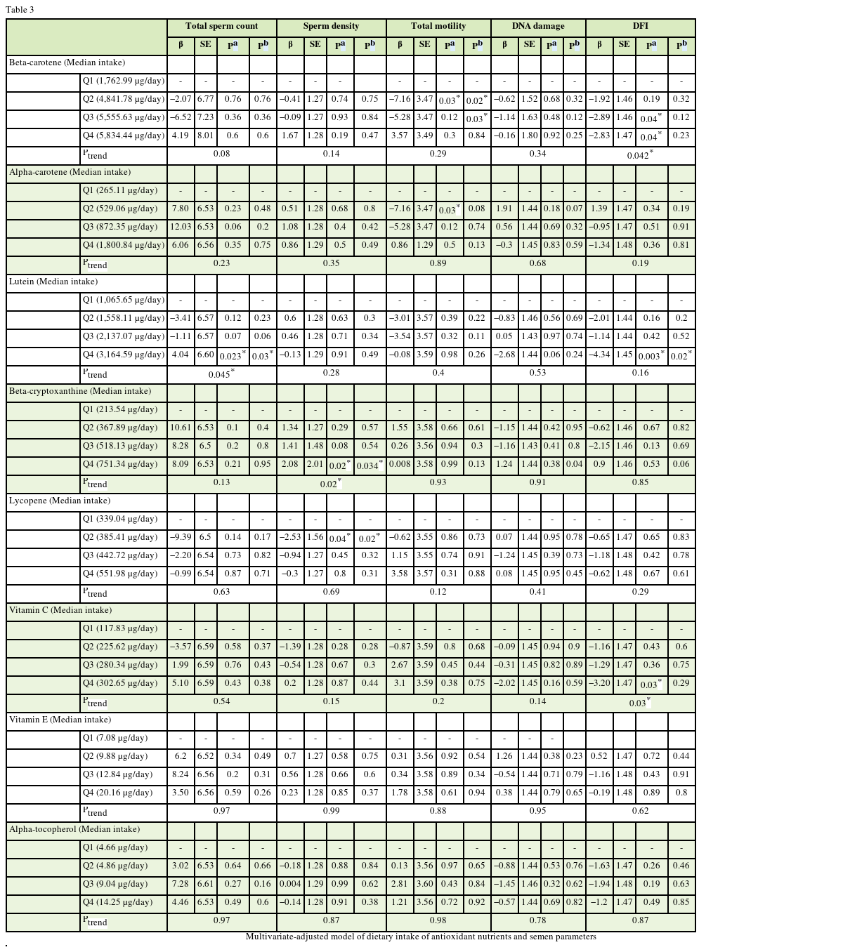 Table 3 presents the multivariate crude and adjusted model of dietary intake of antioxidant nutrients and semen parameters. We found a significant inverse association between β-carotene and vitamin C intake with DFI (P