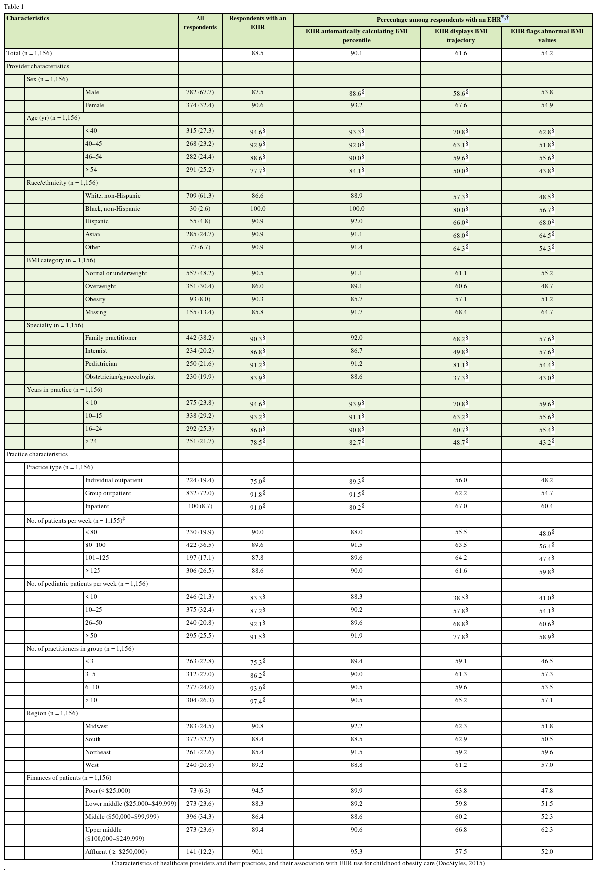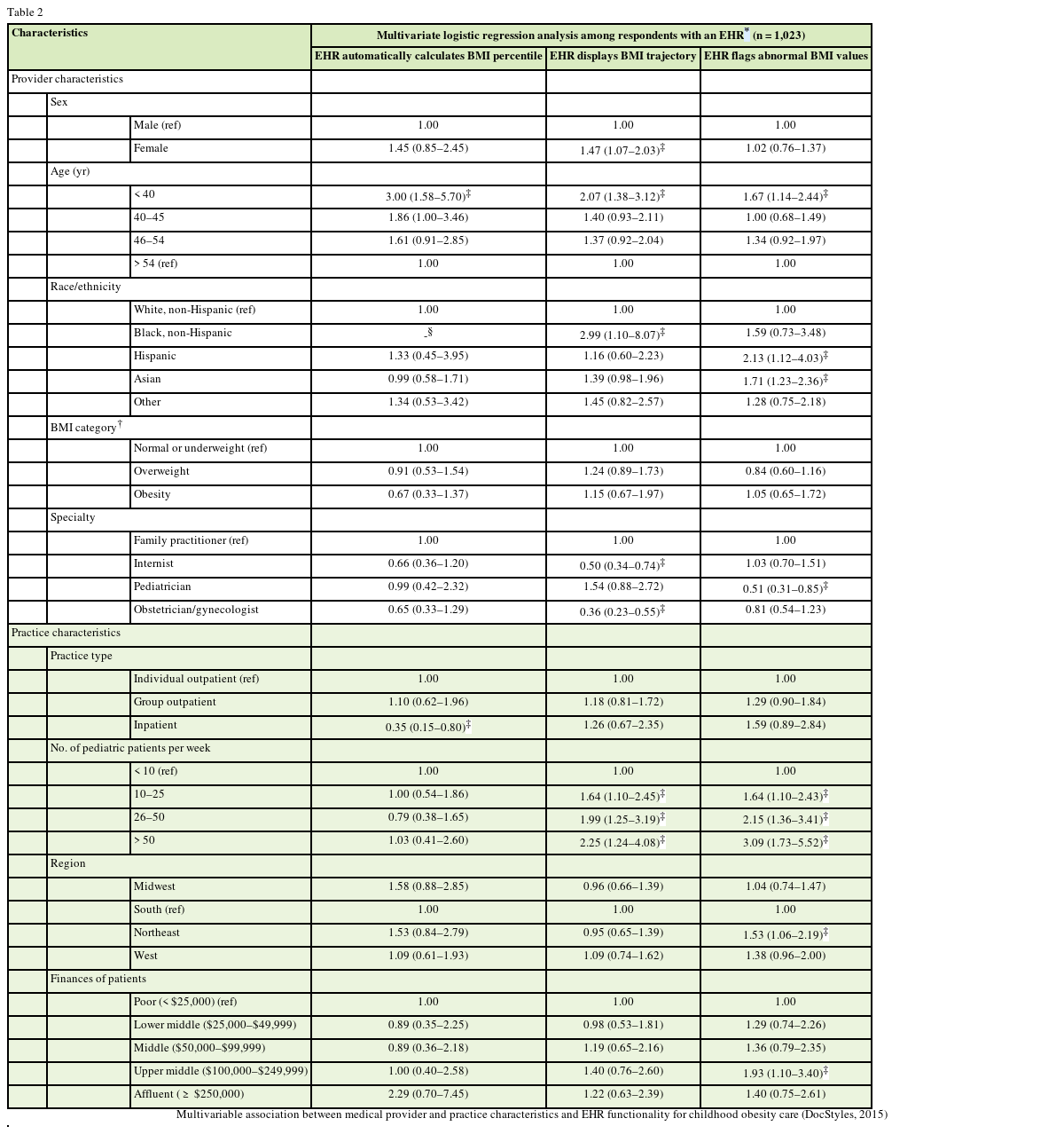 Table 1 Characteristics of healthcare providers and their practices, and their association with EHR use for childhood obesity care (DocStyles, 2015)