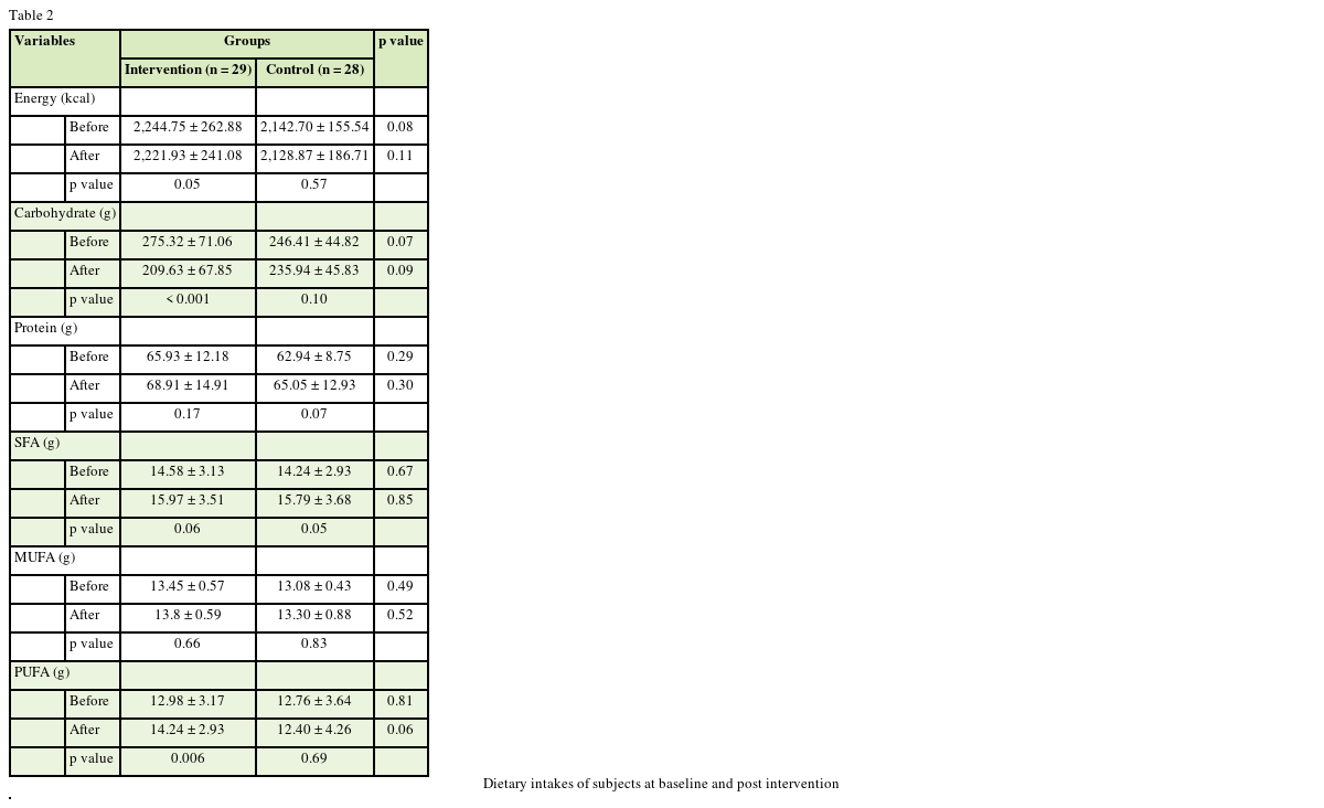 Table 1. Comparisons showed that subjects were not significantly different regarding age, sex, and physical activity levels. Statistical analysis of energy, macronutrients, and dietary intake of polyunsaturated fatty acid, monounsaturated fatty acid, and saturated fatty acid showed no significant differences between two groups and within each group at the beginning and end of the study (