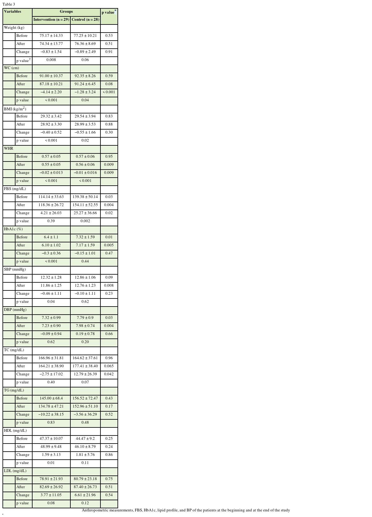 Table 2). The anthropometric measurements of the participants before and after intervention are shown in