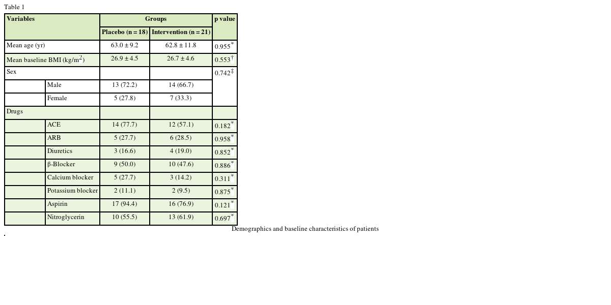 From 39 patients who completed the study, 72.2% in placebo group and 66.7% in intervention group were male and the mean age of the placebo group and intervention group were 63.00 ± 9.27 and 62.80 ± 11.86, respectively.