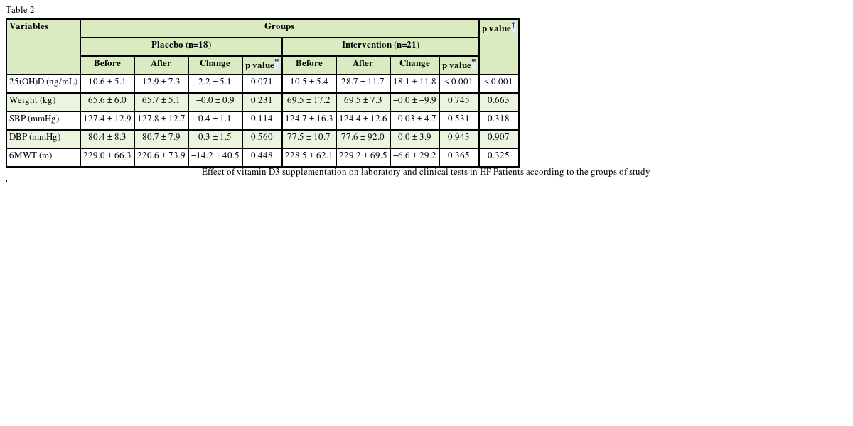 Table 2 Effect of vitamin D3 supplementation on laboratory and clinical tests in HF Patients according to the groups of study
