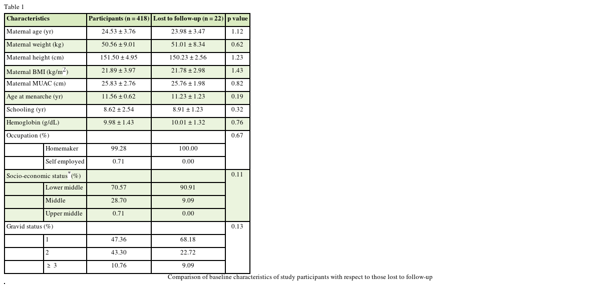 A total of 418 pregnant women could be followed up till delivery of the child out of the 440 recruited initially with 5 having spontaneous abortion, 3 still-births and 14 being lost to follow-up.
