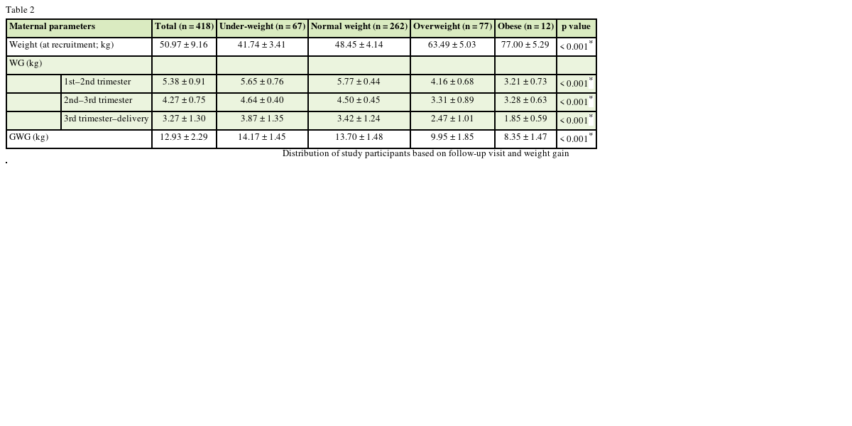 The maternal weight and height—light clothing, no shoes—were measured using digital weighing scales and stadiometer to the nearest 0.1 kg and 0.1 cm respectively in each visit. The BMI was calculated as weight (kg)/height (m)2. GWG was compared with the recommendation of the US-IOM.