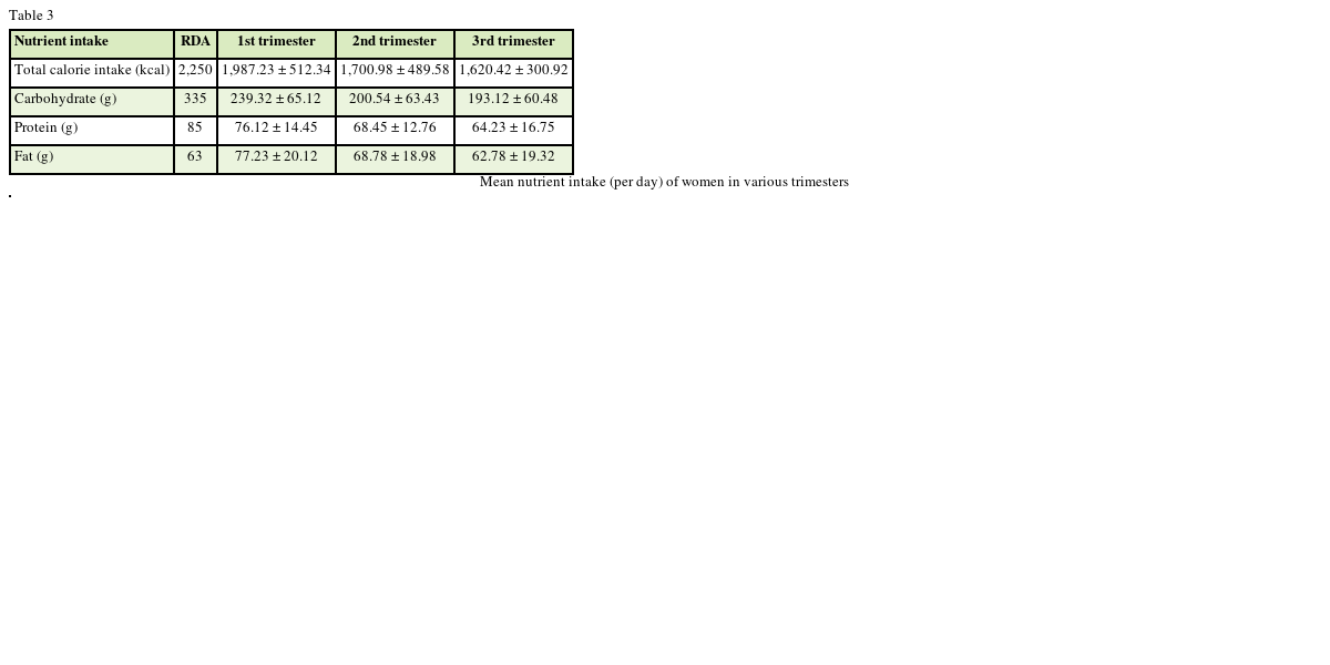 16]. Owing to the fact that dietary behaviour has many implications on mother and child's weight, this prospective cohort study was conducted to evaluate GWG and nutrient intake in all trimesters of pregnancy and investigate the relationship between themselves along with that of BW.