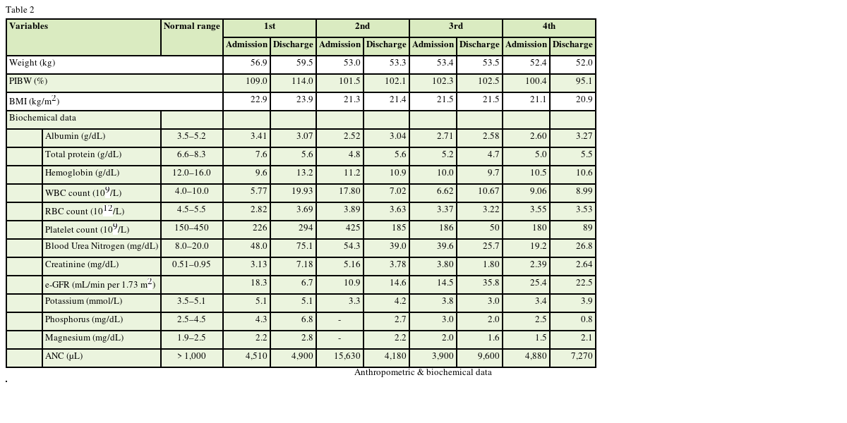 Figure 2, protein supplement through PN was necessary due to low levels of protein intakes in the first and the second hospitalizations, but protein supplement through PN was terminated from the third hospitalization due to the gradual increase in the oral protein intake.