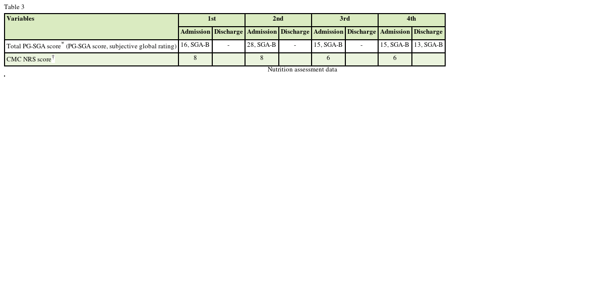 Catholic medical center nutrition risk screening (CMC NRS) and the scored Patient-Generated Subjective Global Assessment (PG-SGA), which is a standard tool to assess the nutritional status of a hospitalized patient, were used. On CMC NRS, he scored 2 points on category of appetite (reduced by more than 1/2 of the usual intake), 3 points on the gastrointestinal discomfort (abdominal pain), 1 point on the defecation disorder (constipation), 1 point on the diet prescription (therapeutic diet), and 1 point on age (≥ 70 year) for a total of 8 points, which identified to be at high risk of malnutrition (CMC NRS score of 4 or higher is nutritionally at risk). The results of assessing the nutrition status using PG-SGA showed that the patient were moderate malnutrition (scored 16 points, SGA-B).