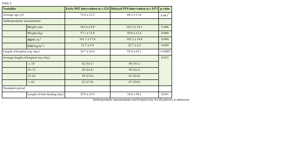 The hospital had an NST consisting of nurses, dietitians, pharmacists, and physicians for admitted patients. When physicians consult with NST, the physician in charge or NST doctor and other NST health professionals review the patient's record and prescribe the required amount of nutrients and the time frame of EN. Besides the NST intervention, the patient's tube feeding status, including the amount and type of nutrients used in tube feeding, were recorded. Because patients who underwent surgery were included in this study, reference point of early NST was set at within 72 hours of admission based on the definition of early NS in previous studies [17, 18]. In this study, patients were divided into two groups: early NST intervention group consisting of patients who underwent NST consultation within 3 days of admission and delayed NST intervention group consisting of patients who underwent NST consultation after 4 days or more after admission. The energy intake ratio (total delivered energy to total required energy), the duration of tube feeding, changes in biochemical indicators related to patient nutritional status, days of hospital stay, and prevalence of malnutrition were evaluated and compared between the two groups.