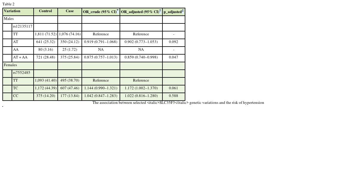 Table 2 The association between selected SLC35F3 genetic variations and the risk of hypertension