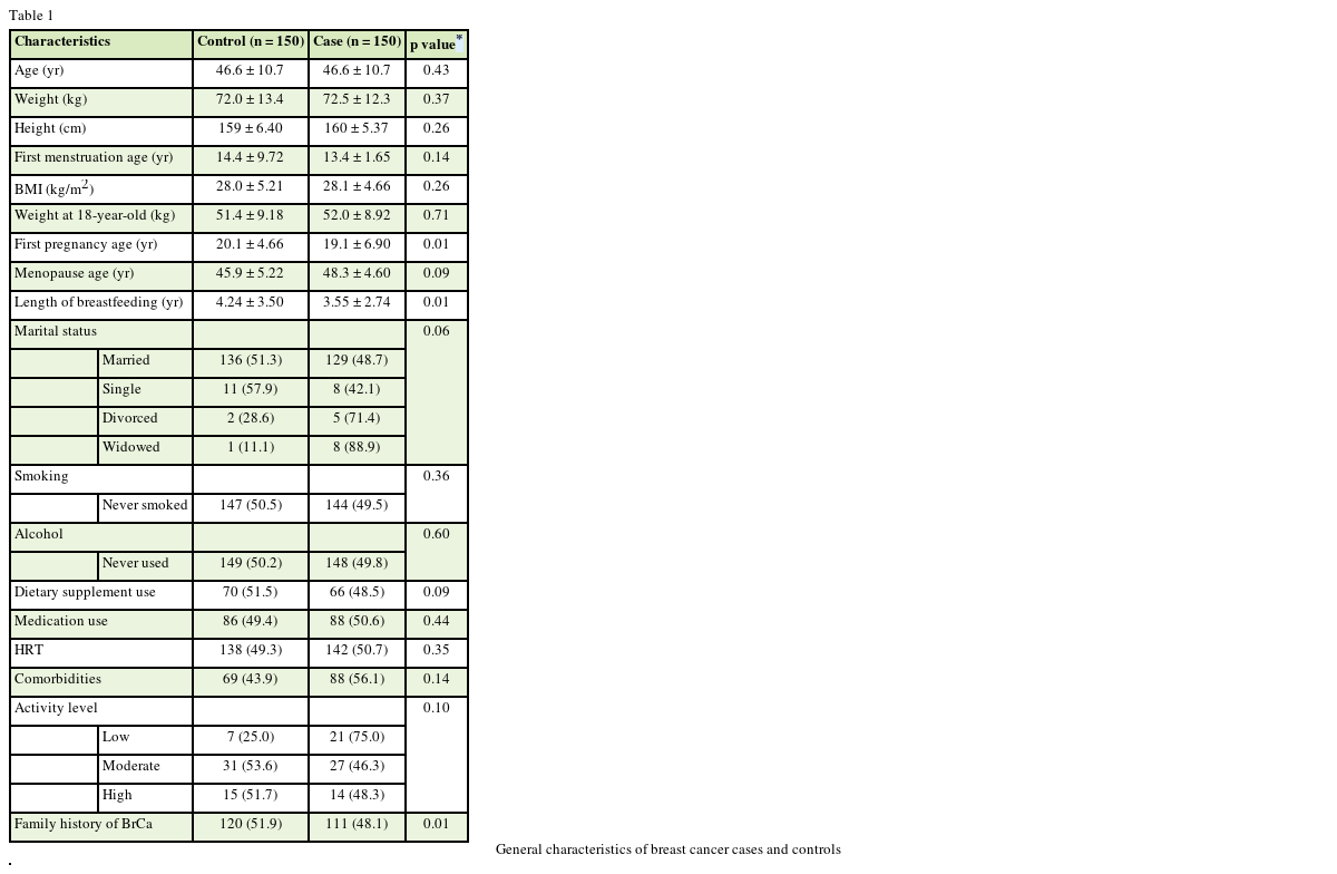 All cases with a history of other cancers were excluded from the study, and even the control group selected in this study had no history of BrCa. Women who had a previous history of breast or other cancers or diagnosis of BrCa more than 3 months were not eligible for this study. In addition, those who were on a special diet were not included in the study. On the other hand, age-matched controls were selected from healthy women, who have no relationship with BrCa patients or had no family history of BrCa. In addition to age, we did our best to match controls in terms of socioeconomic status with the cases. Controls with the following inclusion criteria: female, no history of any malignancy, cysts and, medical disorder, having no special diet, were selected. Controls were randomly selected through poster installation, from visitors, relatives and friends of non-cancer patients in other wards of Imam Khomeini Hospital, such as dermatology, urology, orthopedic, etc., which had no family relationship with cases. Eligible subjects culminated in 150 cases and 150 controls.