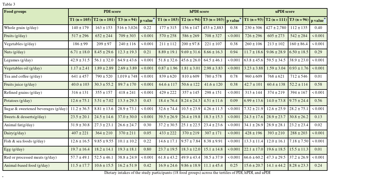Supplementary Table 1). We ranked food groups into tertiles and given positive or reverse scores. With positive scores, participants above the highest tertile of a food group received a score of 3, and those below the lowest tertile received a score of 1. With reverse scores, this pattern of scoring was inversed. For making PDI, plant food groups were given positive scores, while animal food groups were given reverse scores. For creating hPDI, positive scores were allocated to healthy plant food groups, and reverse scores to less healthy plant food groups and animal food groups. Finally, for uPDI, positive scores were allocated to less healthy plant food groups, and reverse scores to healthy plant food groups and animal food groups. The 18 food group scores were summed to established the indices.
