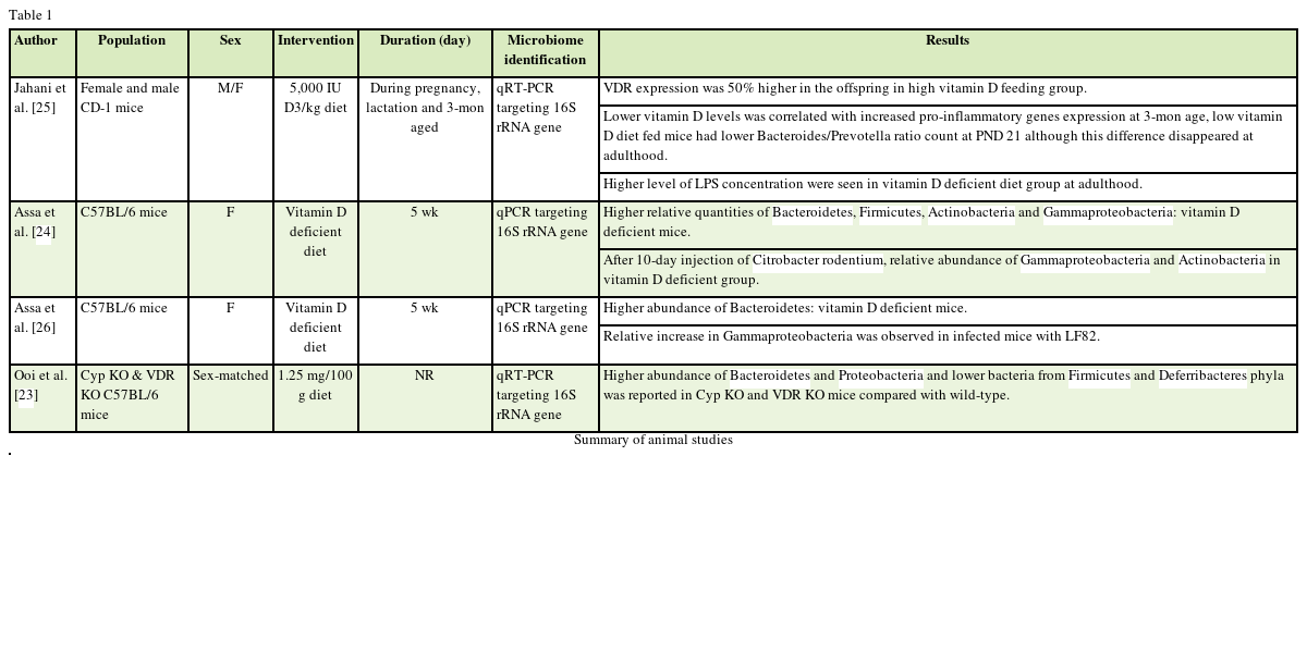 Considering that vitamin D deficiency can cause gastrointestinal disease through its immunomodulatory role, recently, a hypothesis has been suggested on an association between vitamin D and gut microbiota. Recent human and animal investigations have shown that vitamin D could alter microbiota composition through increasing the maintenance of gut homeostasis [23] and decreasing permeability [24]. However, it is not clear how vitamin D could shift gut microbial communities to achieve these goals. Therefore, the present study reviewed the association between vitamin D and gut microbiota composition. The characteristics of studies are presented in details in Tables 1 and 2.