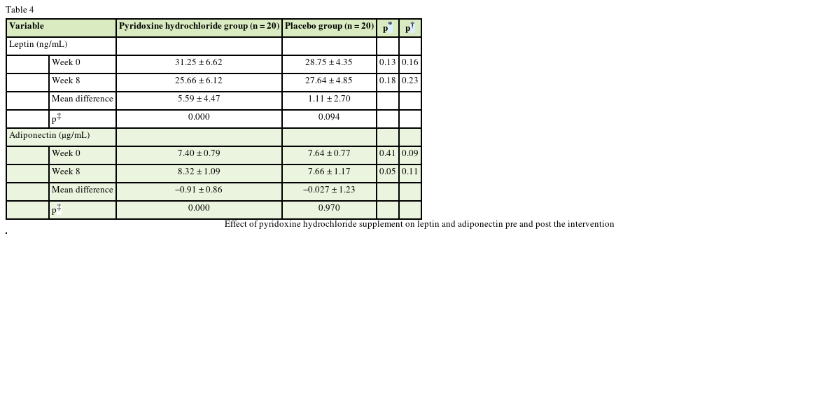 Table 4 Effect of pyridoxine hydrochloride supplement on leptin and adiponectin pre and post the intervention