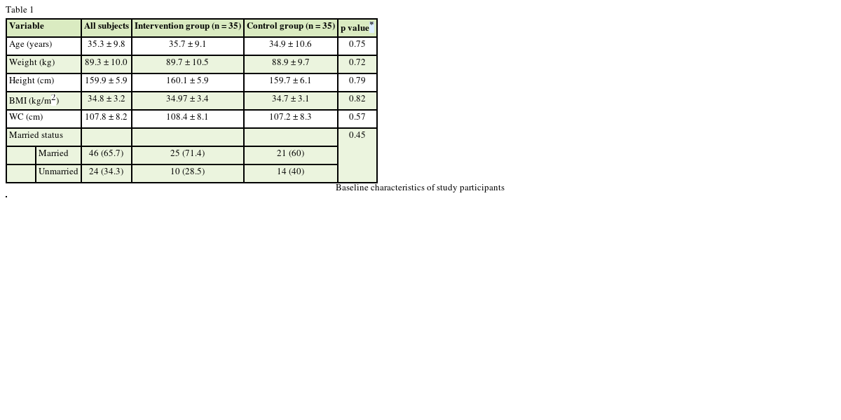 Four participants in the intervention group (three subjects due to noncompliance and one subject due to location change) and three participants in the placebo group (2 subjects due to travel and one subject due to noncompliance), were lost to follow. But, all the statistical analyses were done using the intention-to-treat principle (placebo group, n = 35 and OLE group, n = 35). The study groups were homogenous regarding the baseline age, height, weight, BMI, WC, married status, and physical activity levels (p > 0.05) (