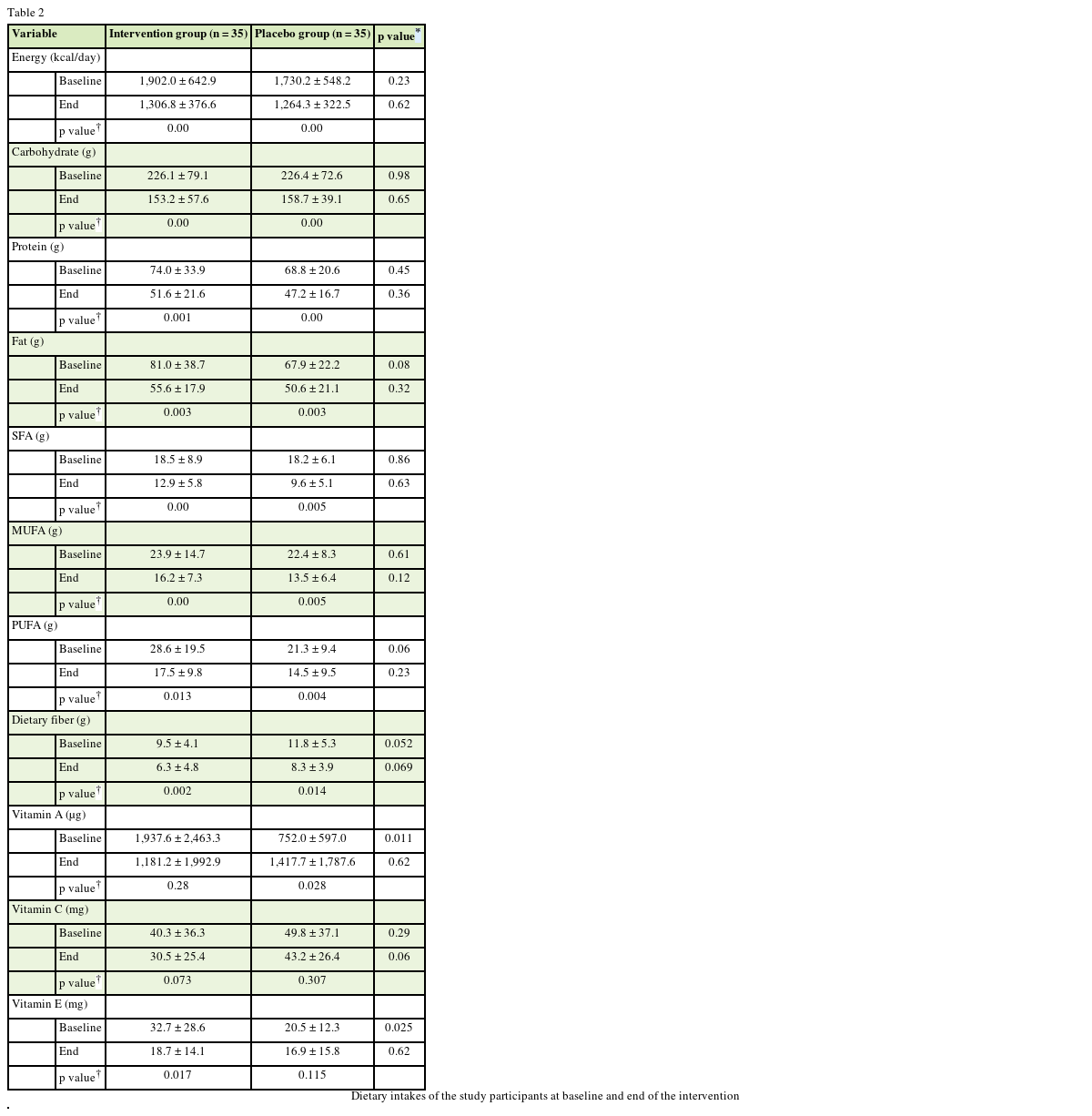 Premenopausal women volunteers recruited through electronic and paper media advertisements and the inclusion criteria were engaged in this trial after receiving their informed written consent. The following inclusion criteria were applied; BMI range of 30 to 40 kg/m2, the age of 18 years and older, absence of food allergies and menopause, having no medical disorders including diabetes, hepatic, cancer, renal, thyroid, and gastrointestinal disorders, no surgery for weight loss, no weight loss over the past 6 months, taking no herbs and drugs reducing appetite and weight as well as nutritional supplements. The subjects with any of the following criteria were excluded: unwilling to continue, no consumption of supplements exceed 10% of total administered supplements, become pregnant during the study, changes in physical activity, and changes in the dietary pattern during the study period.