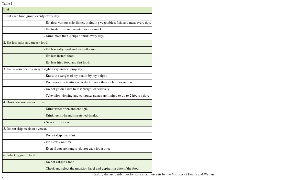 Table 1 Healthy dietary guidelines for Korean adolescents by the Ministry of Health and Welfare