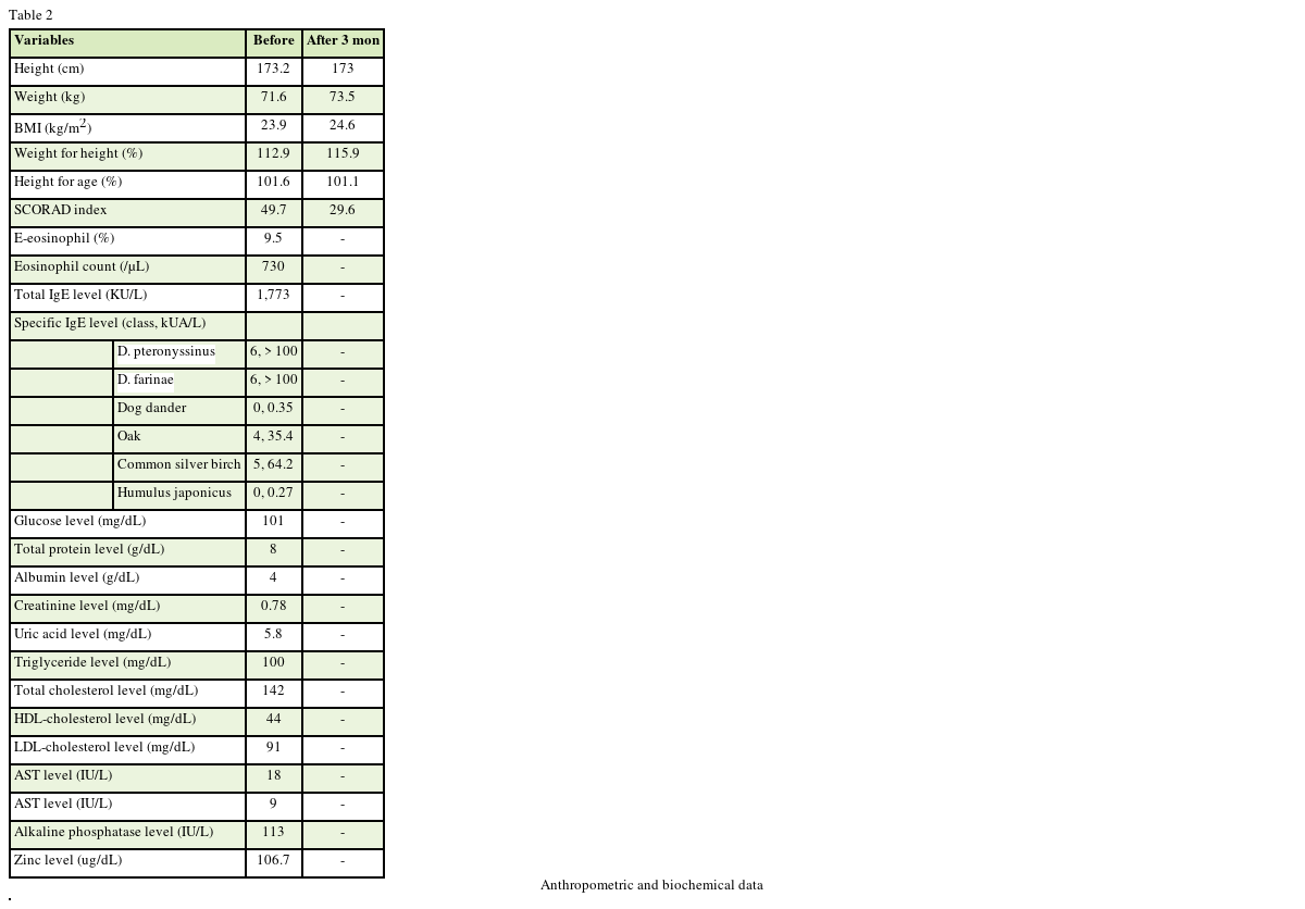 The subject was a 15-year-old male patient who first visited Asan Medical Center in 2020 owing to the persistence of moderate to severe AD during follow-up at other hospitals. Humidifier disinfectant exposure level 4 (extreme low exposure and normal pulmonary function), allergic rhinitis, and asthma were diagnosed; he had no cough, difficulty breathing, sputum, fever, or chest pain. Eczema was observed extensively on the face, earlobe, neck, upper chest, back, axilla, and legs. Avamys, Evoprim (gamma linolenic acid), and Ramnos (probiotics) were taken by the patient and continued until the second treatment. Blood tests showed the percentage of E-eosinophil to be 7.5% and IgE level to be 1,175 KU/L; after 7 months, of E-eosinophil percentage was 10.8%. Additional AD work-up showed positive sensitivities in Dermatophagoides pteronyssinus, Dermatophagoides farinae, common silver birch, and oak (Table 2). The subject of this study refused the blood test after 3 months, so the test could not be performed.