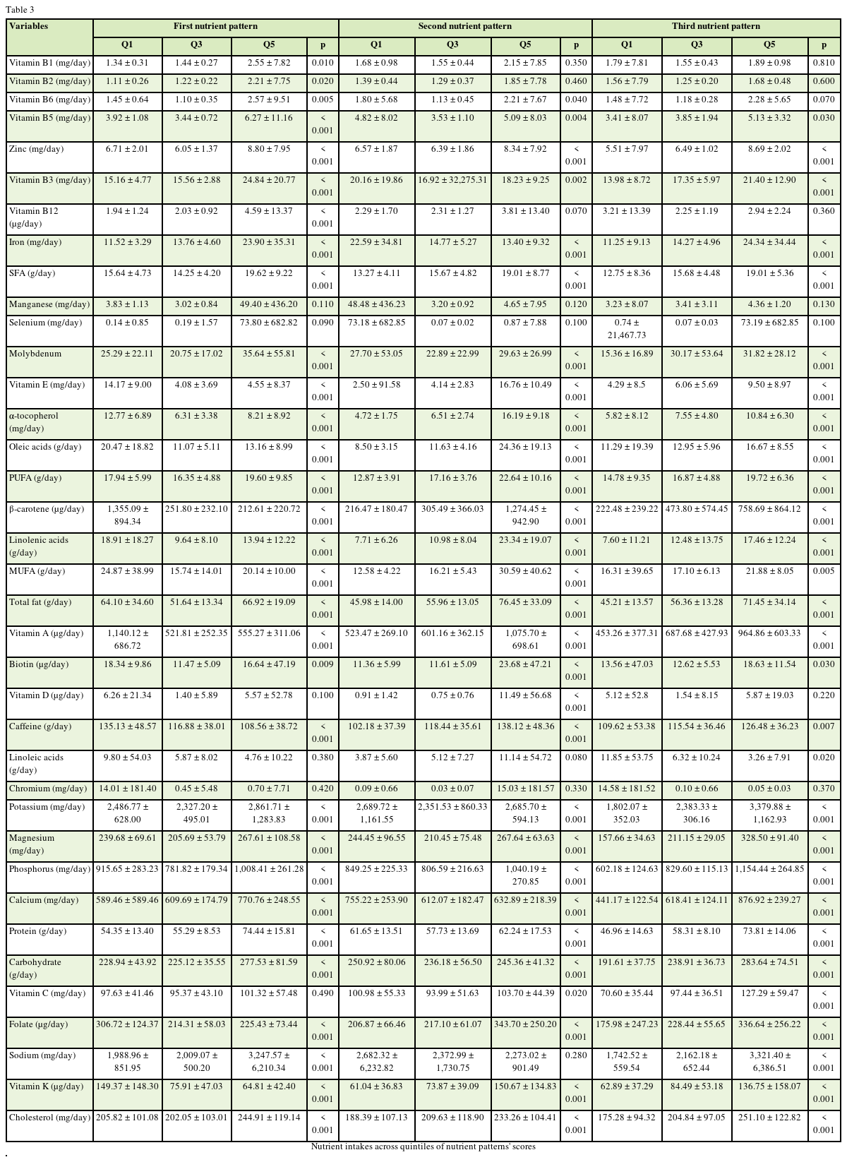 Table 3 Nutrient intakes across quintiles of nutrient patterns' scores