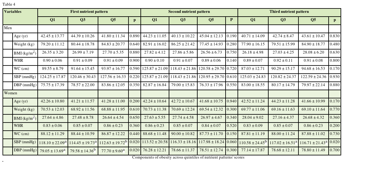 Table 4 Components of obesity across quintiles of nutrient patterns' scores