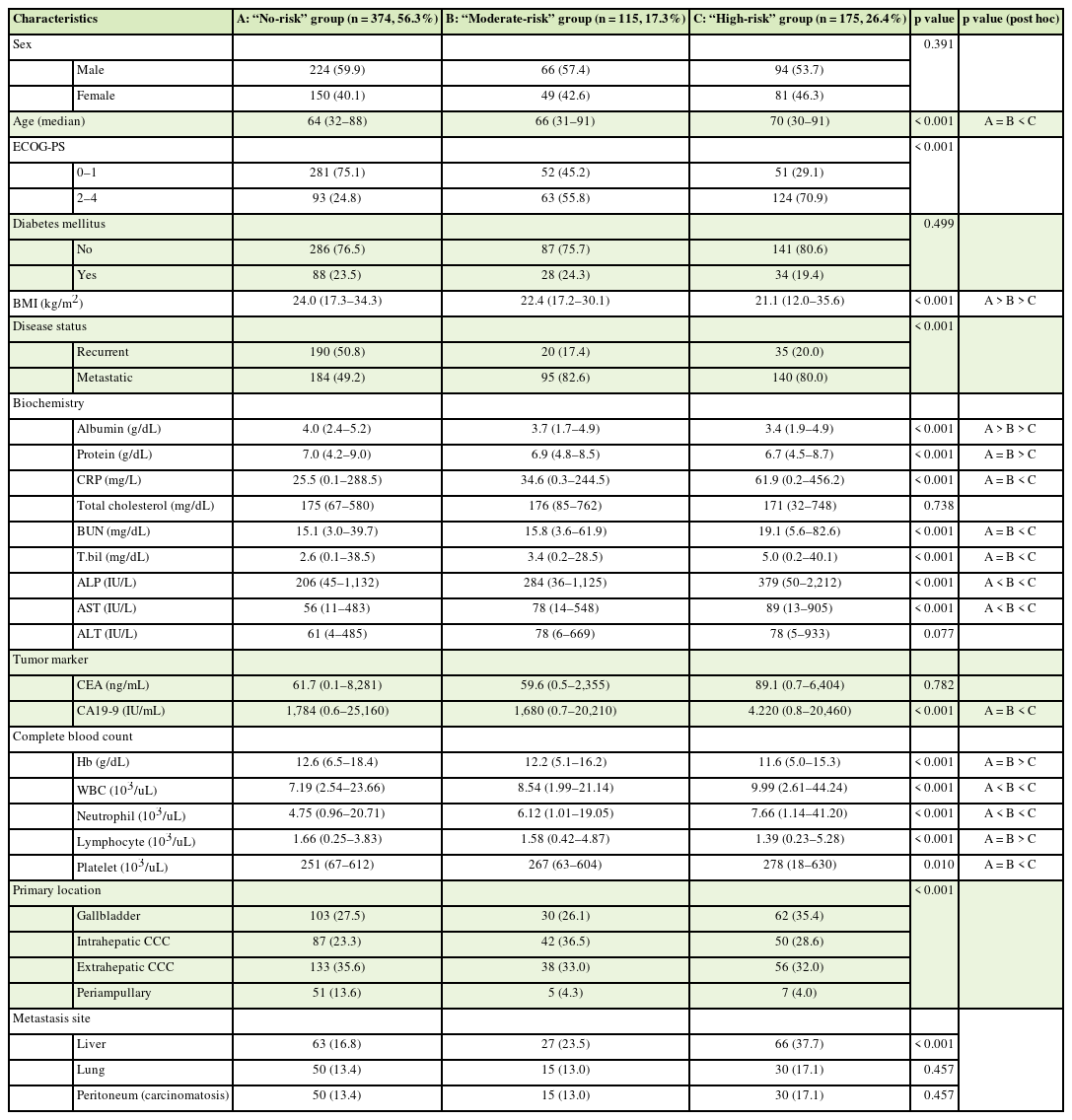 Table 1). The “high-risk” group included more elderly patients (median age, 73), peritoneal metastasis, and poor ECOG-PS compared with the “no-risk” and “moderate-risk” groups. Blood tests also showed differences between groups; the “high-risk” group showed higher levels of BUN, total bilirubin, ALT, CRP, and CA19-9. Conversely, albumin and total protein levels were significantly lower in the “high-risk” group, which also presented significantly lower Hb levels and lymphocyte counts.