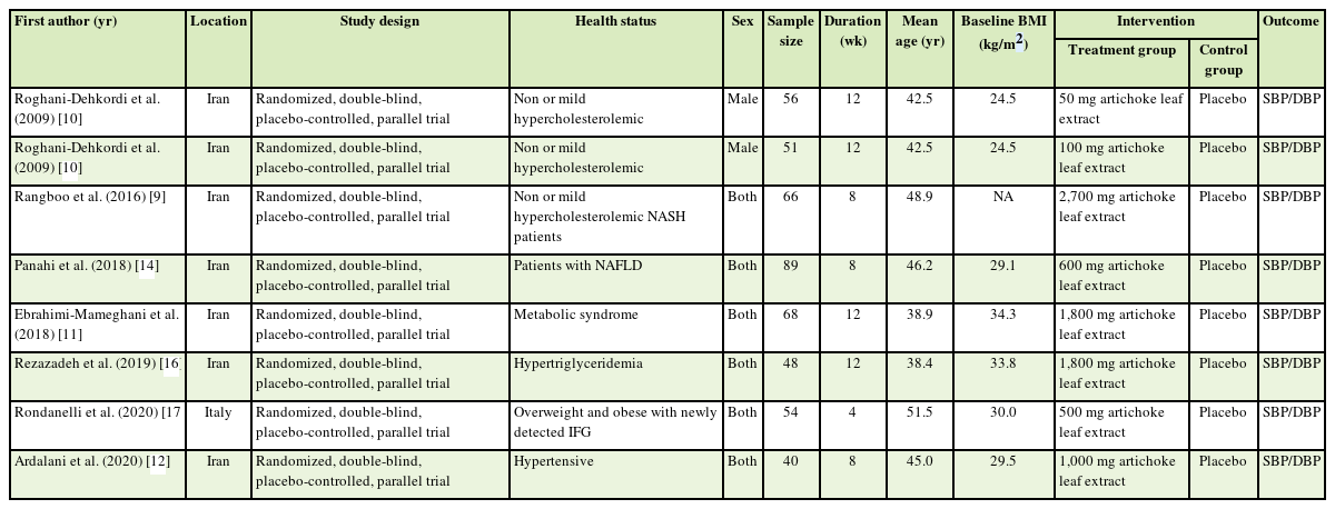Hypertension (HTN) is an independent risk factor for cardiovascular disease. Constant increased pressure in blood vessels can silently damage the blood vessels, heart, brain, and kidneys [1, 2]. The prevalence of HTN increased at an alarming rate between 1975 and 2015 among people aged 18 years and older [3]. HTN is also a lifestyle-related disease and lifestyle changes are effective for its management and prevention including reducing alcohol drinking; avoiding high sodium chloride intake; and consuming a diet loaded with fruits, vegetables, and low-fat dairy products with a reduced amount of saturated and total fat [1, 2]. Recently adherence to the “DASH diet” which emphasizes consumption of fruit, and vegetables have emerged as an effective approach to reducing blood pressure [4]. Besides lifestyle modification, most patients will need antihypertensive drugs to confer multiple mechanisms suspected of having a role in their HTN [5]. Lowering systolic blood pressure (SBP) by 10–12 mmHg and diastolic blood pressure (DBP) by 5–6 mmHg contracts relative risk reductions of 35%–40% for stroke and 12%–16% for coronary heart disease within 5 years of initiating treatment [6]. As long-term use of medications could exert adverse effects comprising dizziness, dehydration, constipation, and drowsiness [7] adopting effective alternative therapies in particular dietary management, which could prevent future complications would be very valuable [8]. One of the therapeutic plants with a beneficial impact on HTN [9, 10, 11, 12] is the Cynara scolymus L. (commonly known as artichoke). Lately, artichoke and its products have gained attention in scientific society. Artichoke is related to the traditional Mediterranean diet style, as is a well-known plant in the Mediterranean countries [13]. Artichoke’s leaves contain polyphenolic compounds, prebiotics (inulin), minerals, ascorbic acids, and folate [13]. Its leaf extract is rich in dietary fibers and antioxidant components [14], proposing the extract as beneficial in the control of HTN. Based on an experimental study, artichoke leaf extract also increases endothelial nitric oxide synthase (eNOS) gene expression and nitric oxide (NO) production in cultured human vascular endothelial cells and enhances endothelium-dependent vasodilation in mice aorta [15]. The current evidence is relatively limited and non-conclusive and only a few studies have reported that the supplementation of artichoke and artichoke products have a promising effect on controlling blood pressure [9, 10, 11, 12]. While these findings are not supported by other studies [14, 16, 17]. A recent meta-analysis indicated that artichoke supplementation did not affect blood pressure. However, it appears that several studies included in that meta-analysis had included artichoke supplementation in combination with other interventions (co-supplementation) that have yielded different results from the present study. For instance, in the study of Cicero et al. [18] artichoke and berberis, and in the study of Ahn et al. [19] Jerusalem artichoke and fermented soybean powder mixture supplementation have been considered combination as an intervention. Also, 2 other articles are included in the present study [16, 17]. Therefore, current systematic review and meta-analysis were conducted to summarize earlier controlled clinical trials assessing the effect of artichoke intake on blood pressure.