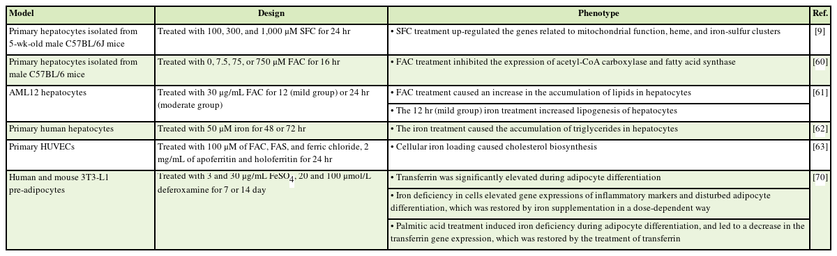 Non-alcoholic fatty liver disease is a complication of obesity, and hepatic steatosis is one of the manifestations of metabolic syndrome. High-fat diet feeding led to weight gain and liver lipid accumulation [33], and iron supplementation decreased lipogenesis and lipid accumulation in the liver, preventing the development of hepatic steatosis [9, 58]. In contrast to in vivo experiments, in vitro studies utilizing mouse hepatocytes showed inconsistent results (Table 3). Iron treatment inhibited the expression of fatty acid synthase and acetyl-CoA carboxylase, enzymes involved in fatty acid synthesis in the liver [60]. On the contrary, 24 hour-iron treatment in AML12 hepatocytes increased the lipid accumulation in hepatocytes [61]. In addition, 48 or 72 hours of iron treatment also caused triglyceride accumulation in primary human hepatocytes [62]. Despite inconsistent results in in vitro studies, most showed an increase in lipid accumulation in iron-treated cells [61, 62, 63]. It can be presumed that inconsistent results between in vivo and in vitro studies are due to the presence or absence of interactions with other organs.