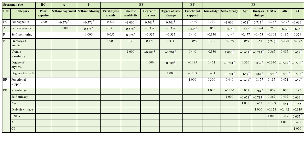 Figure 2 illustrates how the dietitians utilized the evaluation for the nutritional status of HD patients with poor appetite. Using the structure provided by the tool and identifying patient problems within the context of the ICF has the advantage of not only considering one-dimensional factors but also reflecting various factors for the dietitians, which are the most important to the patients. These factors include formulating a self-care process and identifying other resources (i.e., social support) to help manage some factors outside the typical scope of nutritional therapy. The dietitians were also able to identify personal factors that could be a facilitator or barrier to the patient’s overall progress. By doing this, the dietitians accentuated the facilitators (self-efficacy) and the barriers (oral dysfunctions) to help patients achieve their goals as quickly as possible. Considering the relationship among components in the ICF model, self-management was negatively related to poor appetite in malnutrition. There were several environmental factors and personal factors that were positively related to self-management. Sensitivity of uremic removal in oral dysfunction, self-monitoring in participation, and functional support in the environmental factors were positive relations with self-management. For the personal factors, self-efficacy, albumin level, and CI were positive relations with self-management.