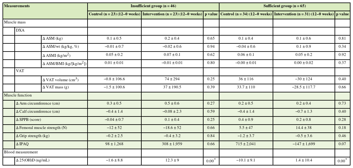 Exercise is considered standard treatment to increase muscle mass and improve body function in people with sarcopenia. However, this study aimed to investigate only the effects of nutritional interventions to rule out the effects of exercise. Serum 25(OH)D concentration increased significantly after 12 weeks in both groups taking the supplement, and further increased in the insufficient group (insufficient group: from 25.11 ± 3.68 ng/mL to 37.47 ± 7.83 ng/mL), (sufficient group: from 41.97 ± 9.34 ng/mL to 43.41 ± 10.79 ng/mL), which shows the result of a change from an insufficient state to a sufficient state for the insufficient group.