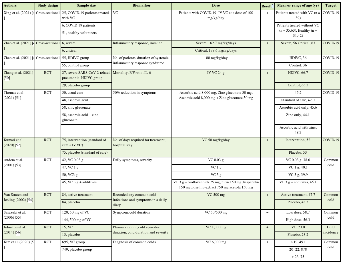 47], and C-reactive protein levels were significantly reduced when 162.7–178.6 mg/kg/day of vitamin C was consumed (p < 0.05), and lymphocyte counts, CD4+ T-cells, and respiratory function were significantly increased (p < 0.05) [