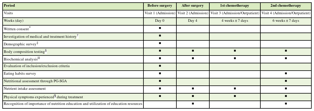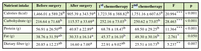 19]. The first survey was conducted based on usual eating habits before surgery, and the second survey was conducted on the same survey paper during 2nd chemotherapy to observe changes in eating behavior during the treatment period. Nutrient intake was evaluated throughout the entire 4th interview stage, and daily dietary history was investigated using a 24-hour recall method, followed by nutritional analysis using the Can Pro 5.0 (web version) of the Korean Nutrition Society (Seoul, Korea).