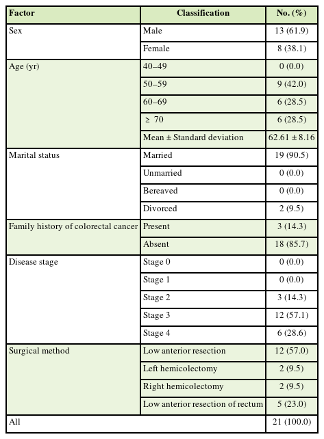 Table 1. Information about sex, age, marital status, family history of colorectal cancer, disease stage, and surgical method used for the patients was obtained by referring to medical records. Stage classification was performed using the TNM classification of the American Joint Committee on Cancer.