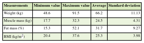 Table 2). The average weight was 63.62 kg, the average muscle mass was 23.68 kg, the average fat mass was 31.29 kg, and the average BMI was 25.3 kg/m