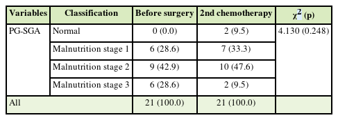 Figure 2). The general characteristics and anthropometric values of 53 patients were analyzed (before surgery). For each item of the treatment process, analysis was performed on 21 patients who participated in all four interviews (before surgery, after surgery, 1st chemotherapy, 2nd chemotherapy).