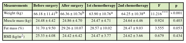 According to biochemical analysis results, hemoglobin, total protein, albumin, and lymphocyte levels after surgery were the lowest among all stages during the study period, and WBC levels were the lowest during 2nd chemotherapy. Since stress response and catabolism increase after surgery, the plasma protein level may lower temporarily, and hemoglobin can be lowered in case of bleeding [